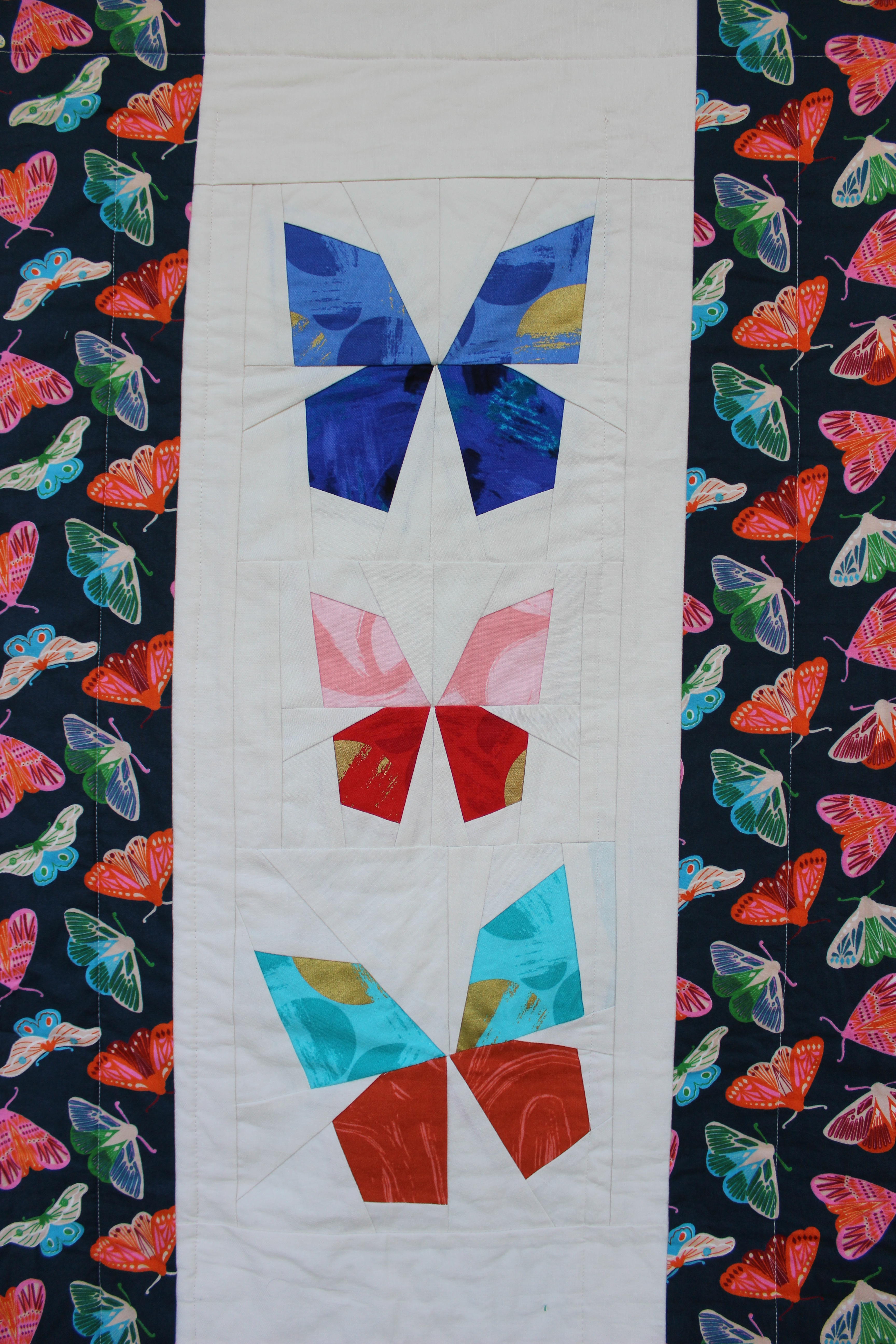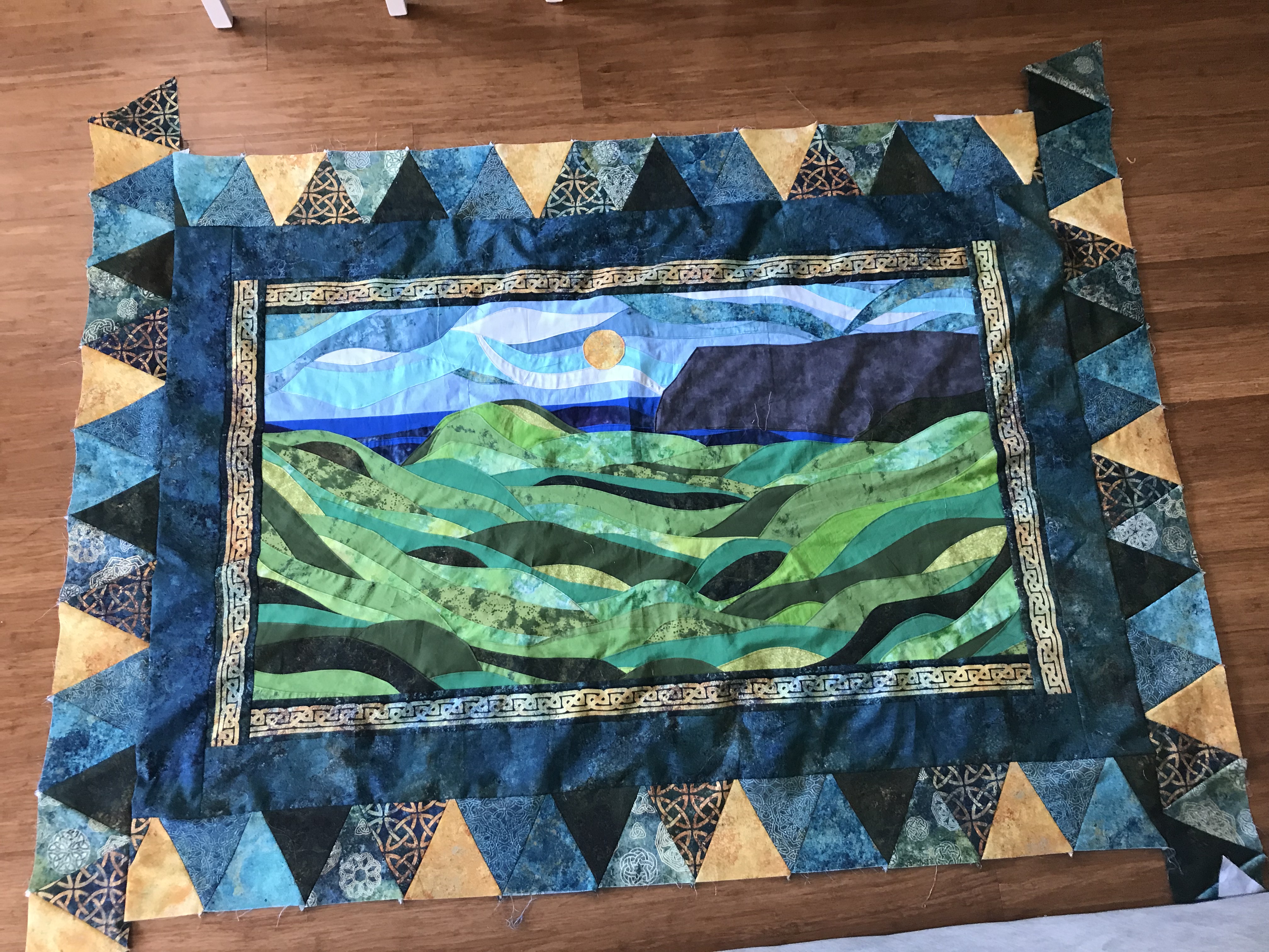 I struggled a lot with tension problems in this quilt. Specifically within the center panel. So much so that I hadn’t even really considered what I was going to do with the rest of the quilt. Then I came across this stunning Celtic fabric in a small town quilting shop, and it all came together. The tension did get a little worse though because I had to go back and incorporate some of the new fabric into the already mostly finished center panel. Adding long strips as boarders seemed to fix the majority of the tension issues so I’m glad I went with that option.