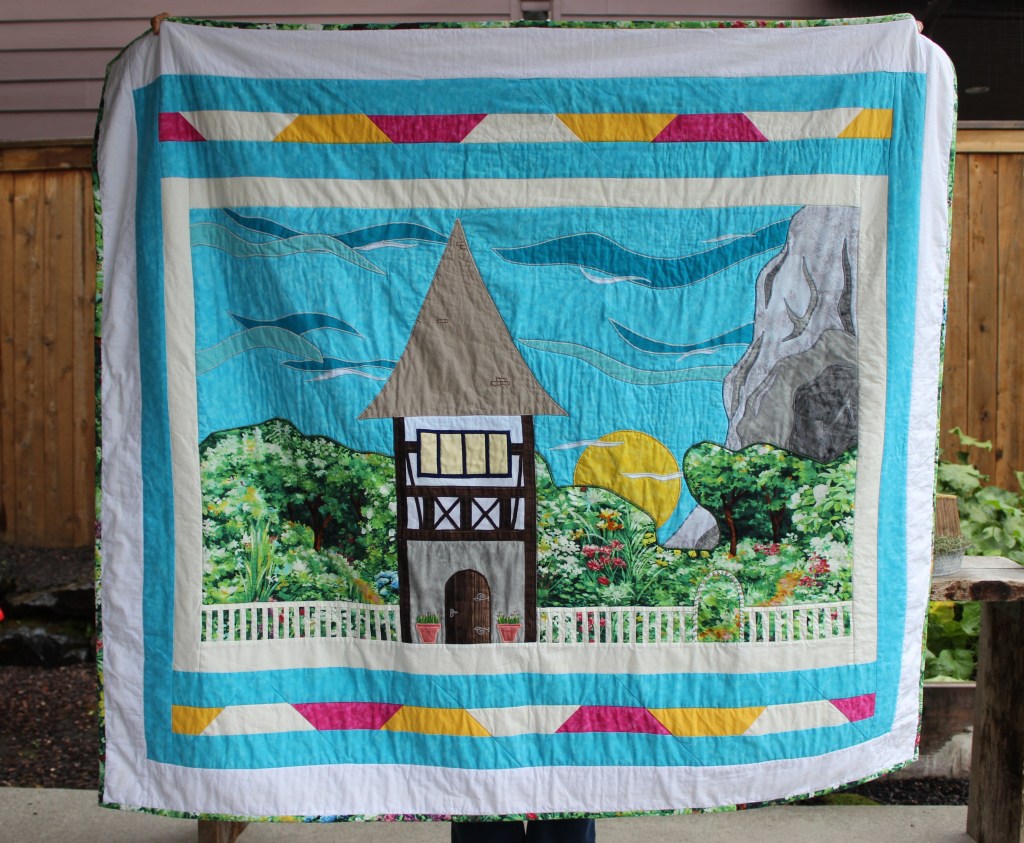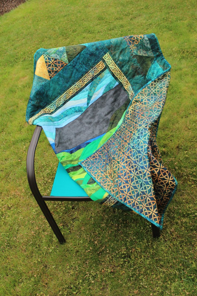 This quilt took more time to make than any of my other quilts have. The center panel of this quilt is based on a family member’s photograph of a place in Ireland called Cushendall, County Antrim. I was asked to make this for some family members who were having a baby. Even though I took some creative liberties with it, I hope they enjoy it.
