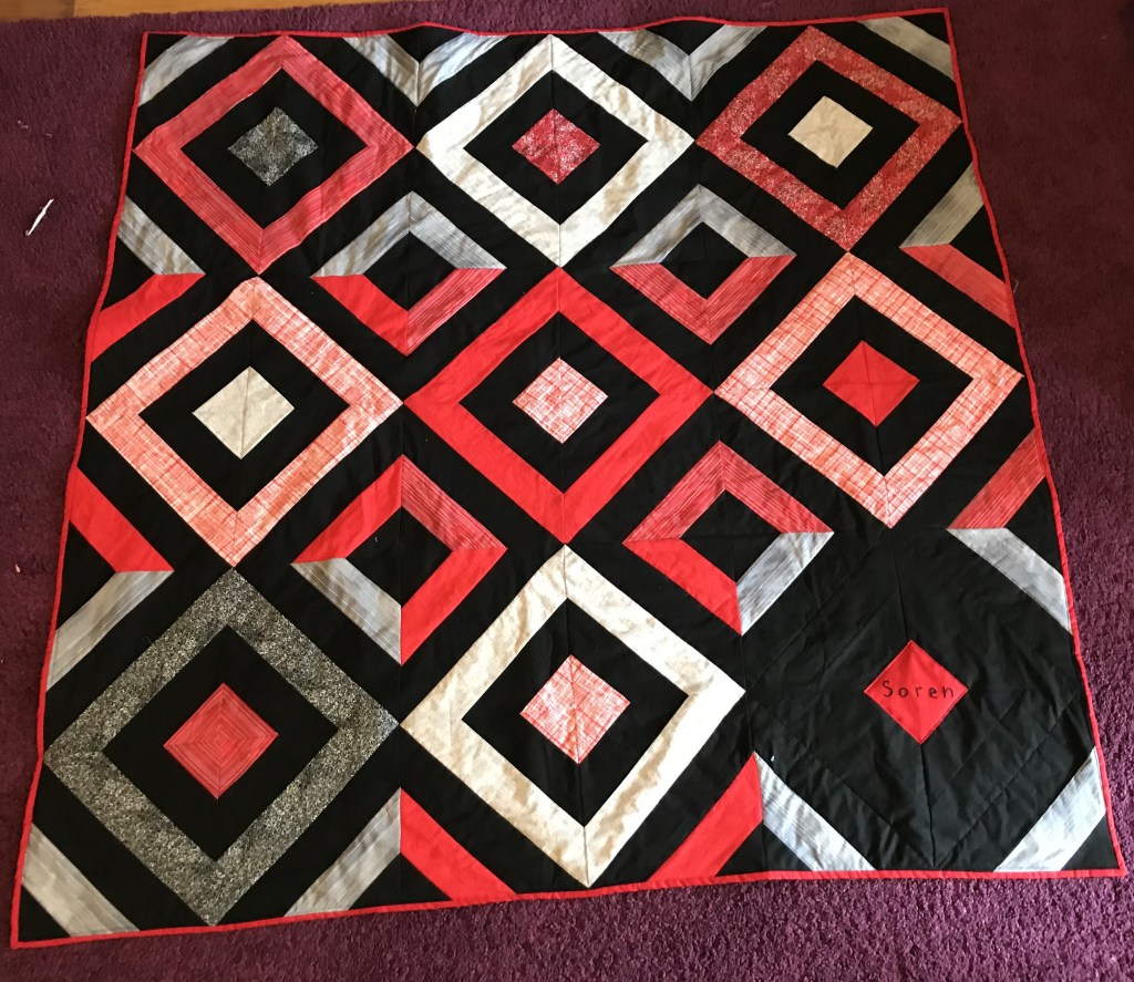I had spent a while trying to figure out what to get a young boy for his birthday and I decided, screw it, I’ll just make a quick quilt with my fabric stash. Quick and easy…yeah, sure.