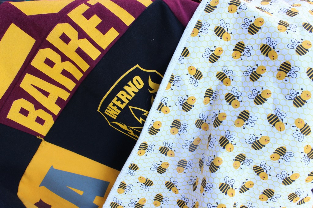 The backing fabric might seem odd since ASU’s mascot is not bees, but when my sister was going to school they had frequent bee alerts (because they get giant swarms of bees there). This cute fabric gave the “memory” quilt more meaning than the shirts alone.