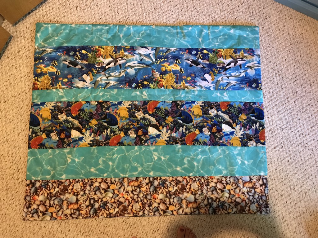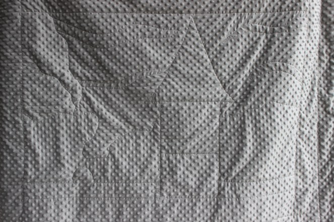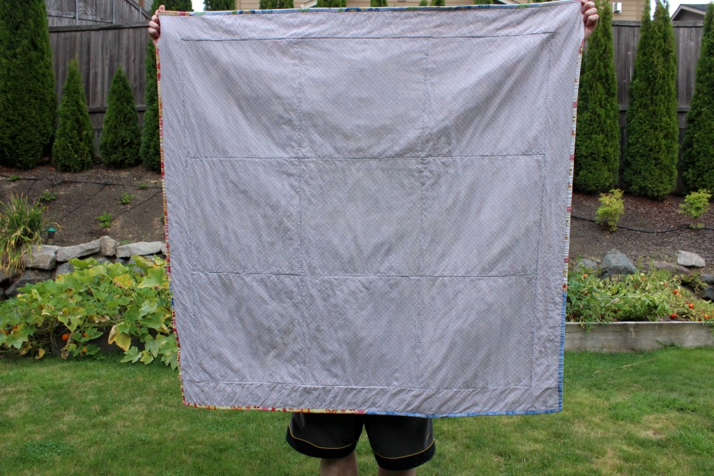 Which brings me to my next point, which is that I wanted a free project. I stitched together scraps of batting I had saved in order to make one big sheet of it. I used fabric left over from one or two projects. For the backing I used a white blanket that was laying around that we never used and don’t even know where it came from. I even used dark blue thread (gasp!) to sew all of my piecing together, most of which is white. It shows in places, but it’s on the inside so I didn’t care.