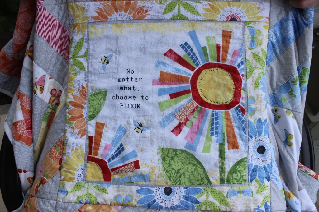 I designed the center panel to mimic my cartoon drawing style. In the future I would like to do more quilts this way (based off of drawings).