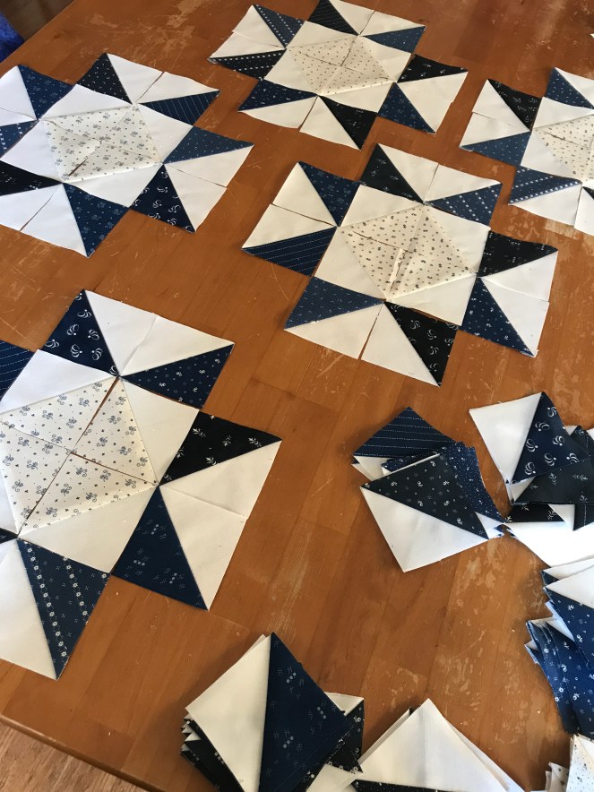 The pattern we decided on was a pattern I had done before a few times, but laid out in a different way to give the appearance of X’s instead of squares. Super easy to work with, especially since I bought the white fabric in pre-cut jellyrolls.