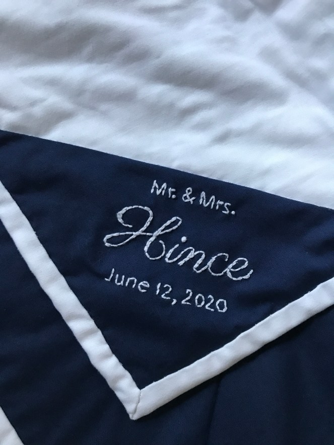 This quilt was commissioned by a friend for someones wedding. It was also my “pandemic project”. We were picking the fabric at a time where I was unable to go to the store and online stores were selling out FAST! Every time I found fabric that would work, it was sold out from under me and I had to start over. I liked the idea of using charms to save time (since I wanted to finish before the wedding) and I am so happy that I was able to finally find someone on Etsy who sold some I could use.