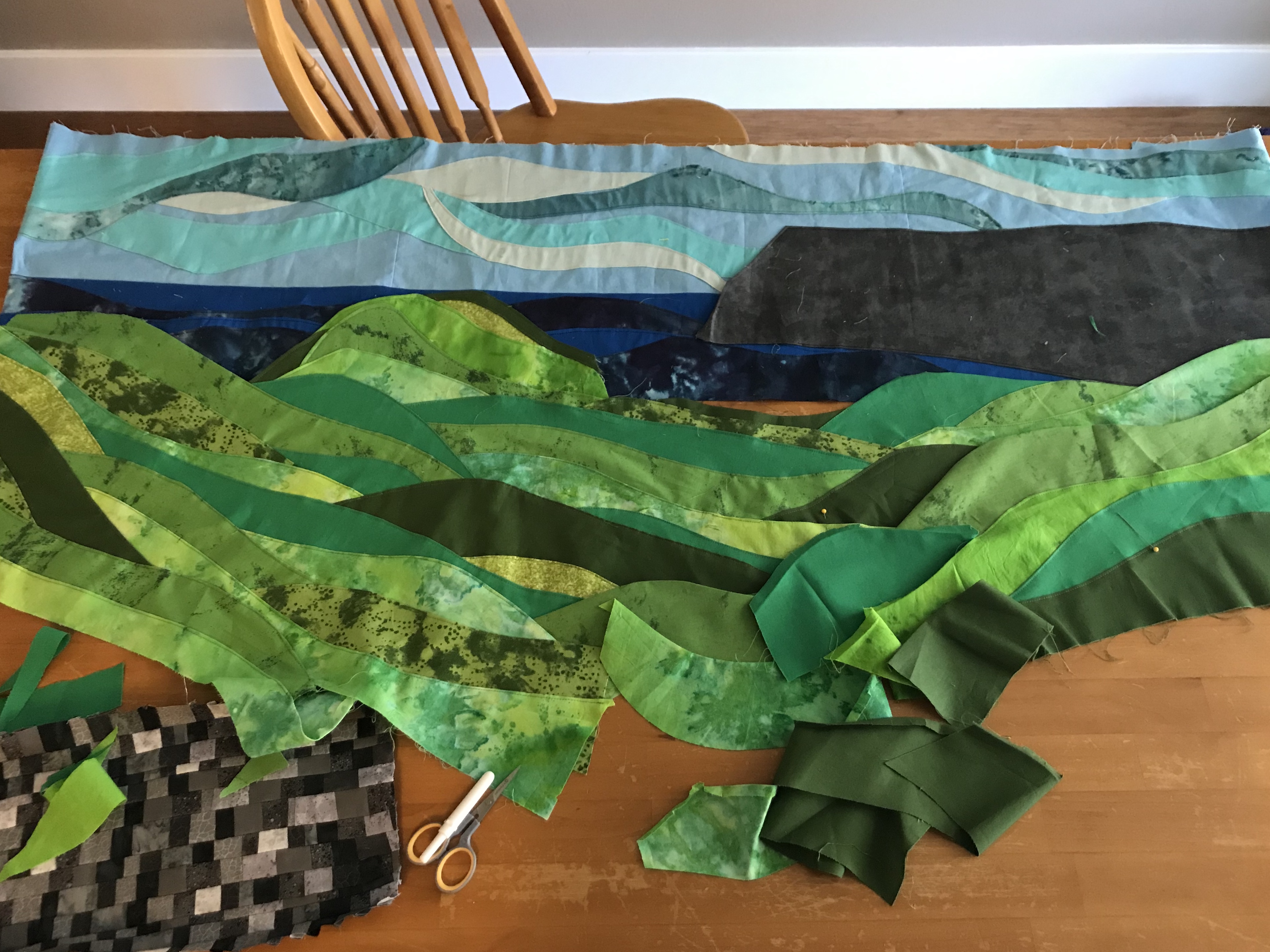 Aside from the photograph, I was inspired by a quilting technique called accidental landscaping or accidental landscape quilting. Since I couldn’t find anyone online who had done it as more than just a wall hanging or a decorative quilt, I had to figure it out as I went along.