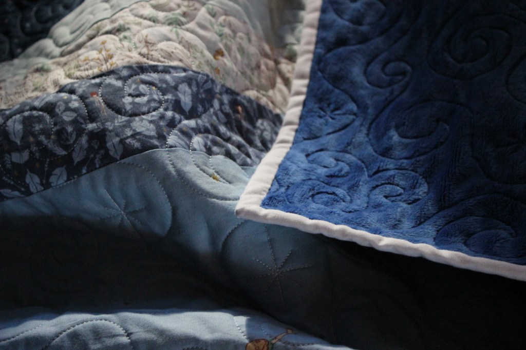 When it came time to quilt it, I struggled between keeping it a free quilt, or buying white thread. The fancy stitches used up more thread than I anticipated on the top layer. I didn’t have enough blue thread to do the binding and quilting. My options were to use another contrasting color, or buy white. If on the final stretch of my quilt I did things that would make me dislike the quilt, then being stubborn about it being free wasn’t going to be worth it. It pays to be honest with yourself and I knew if I used any color other than white for the quilting, then I wouldn’t like the quilt, and I would never use it. Back in the closet it would go, taking up closet space, and it would defeat the main purpose of the quilt in the first place.
