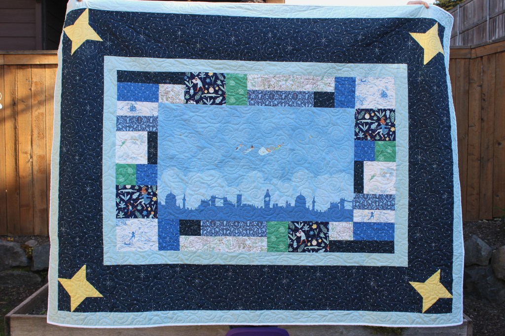 This Peter Pan Quilt was a spontaneous addition. I originally had a lap sized blanket in mind for someone but every time I worked on it, my husband would ask if we were going to keep it because he thought the fabric was so fun. I ended up having enough fabric to make a second quilt that we could keep and ended up with this twin sized quilt.