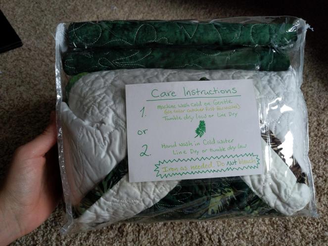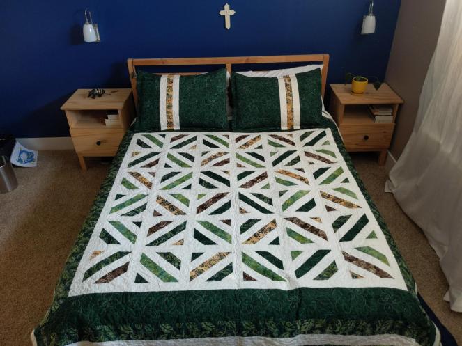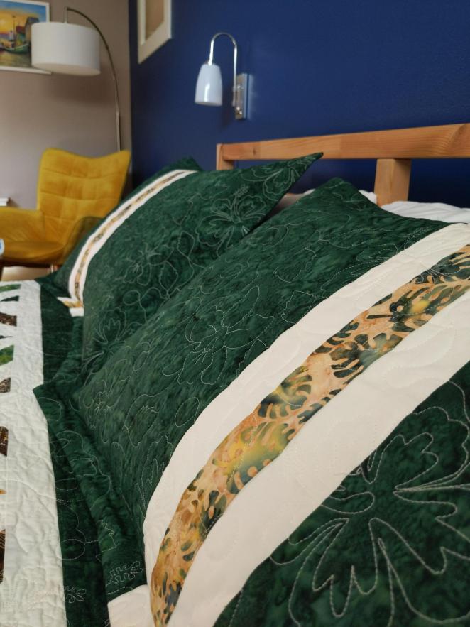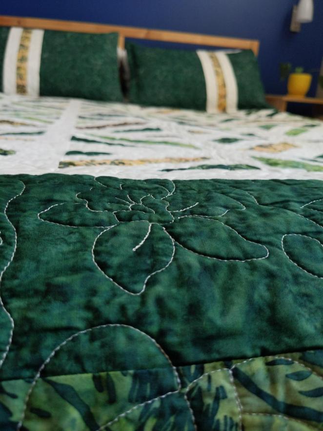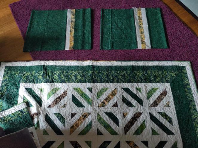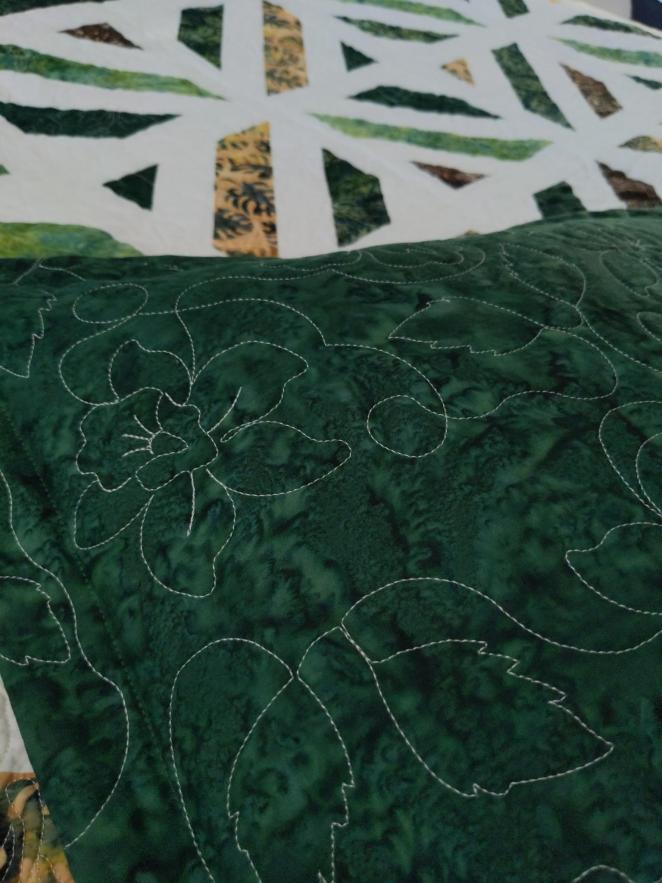 The pillow shams gave me a bit of a hard time, but thanks to one of my sisters, it was decided that they looked weird because the green was too intense next to the quilt now that the quilt had been quilted with white thread.