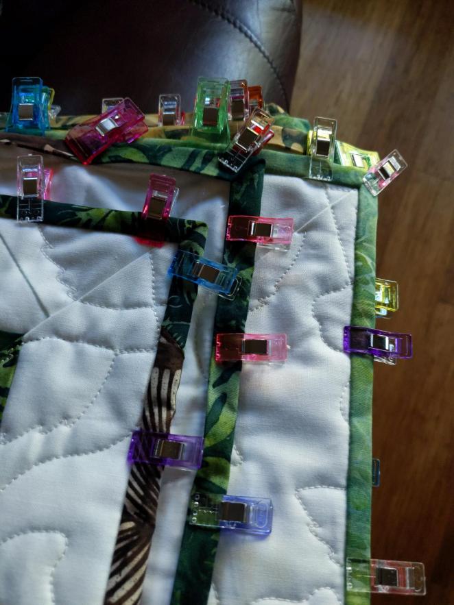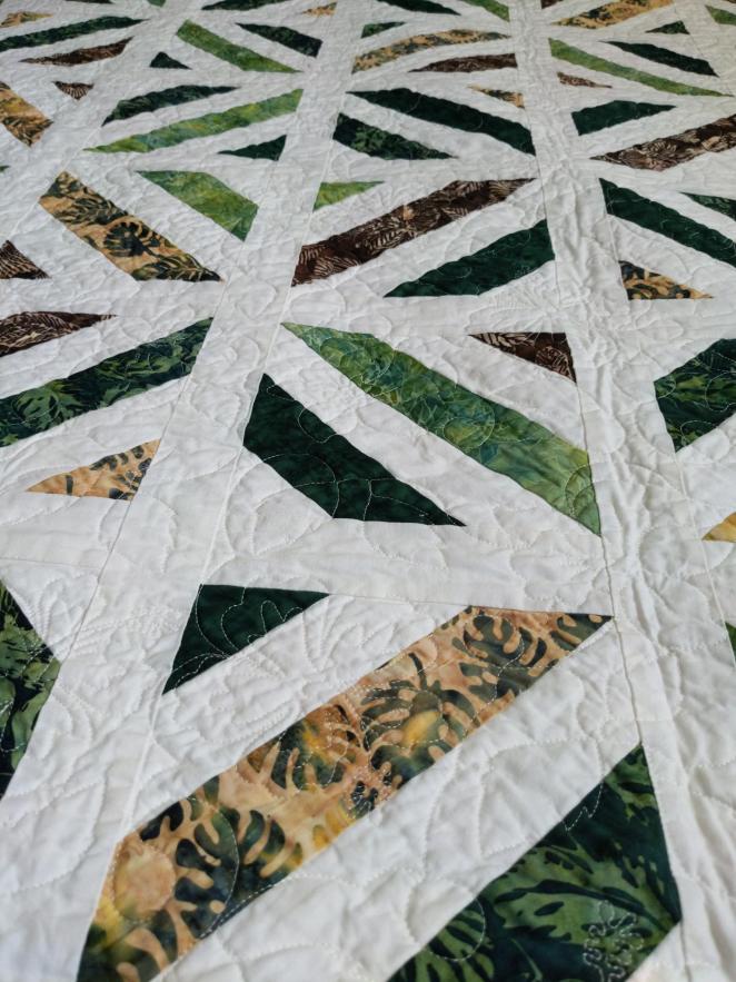 One of my mom’s guest rooms is Panama themed and she wanted a quilt that was going to match all of the Panamanian/tropical items she already had in the room. When she came to visit, we went to pick out fabric and she chose a wonderful set of batiks that were a beautiful greens, browns, and tans.