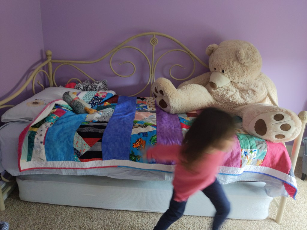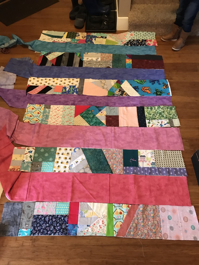 After she said there were enough strips, I gave her a few options on how we could put it together. She asked for colored strips in between. I took her to the store to find backing. She choose a fuzzy, pink fabric that has a bubble wrap-like texture. Not something I would have chosen, but man oh man, is it soft. It’s the coziest quilt in the house.