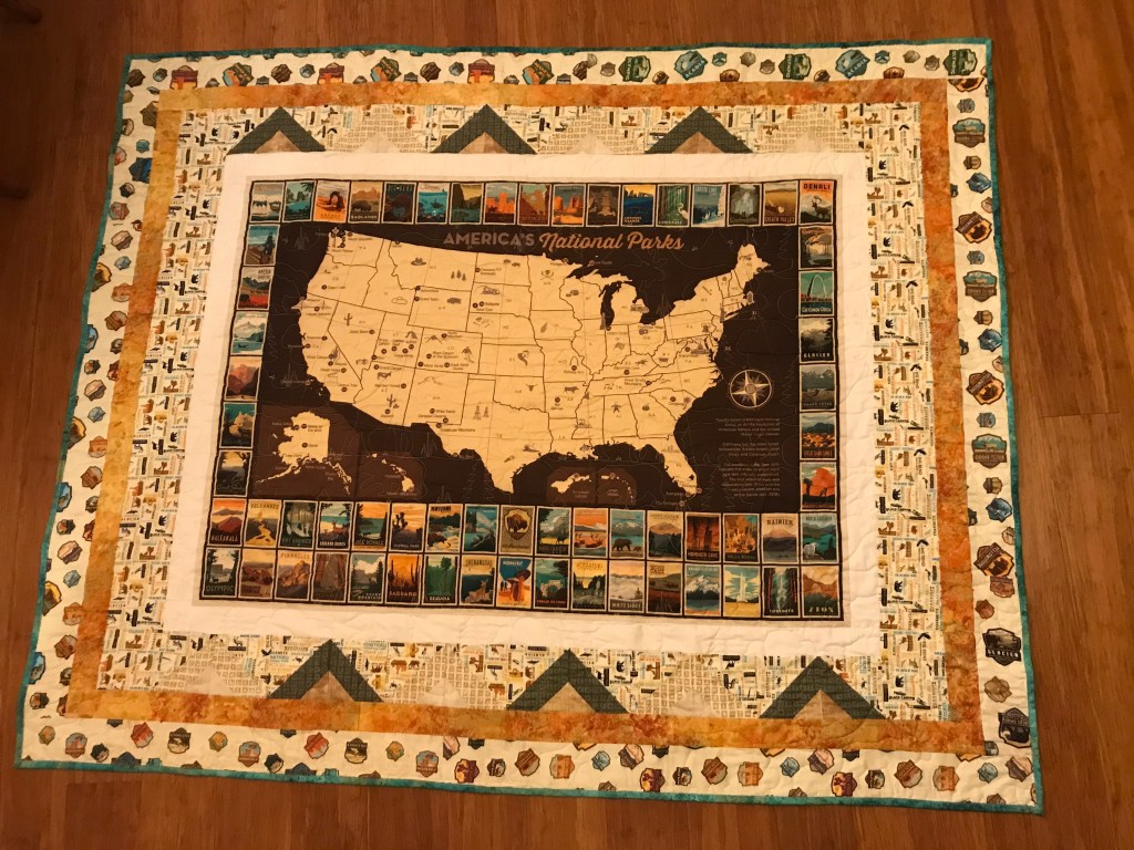 When I saw this fabric, I knew I had to make a quilt for a special someone. I have a family member who has made it their mission to visit all the state parks and I believe they finished their quest a year or two ago.