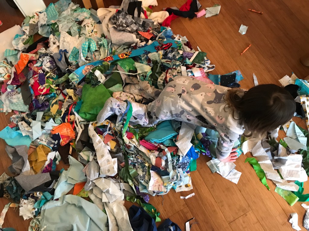 My daughter always wants to cut, pin, or tell me what fabric (or as she says, frabric) to use when I’m quilting. She has been very interested in my fabric scrap box ever since she discovered it at the age of 2, and shortly after asked me to make her a fabric monster costume.