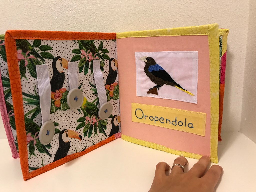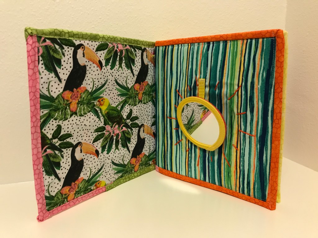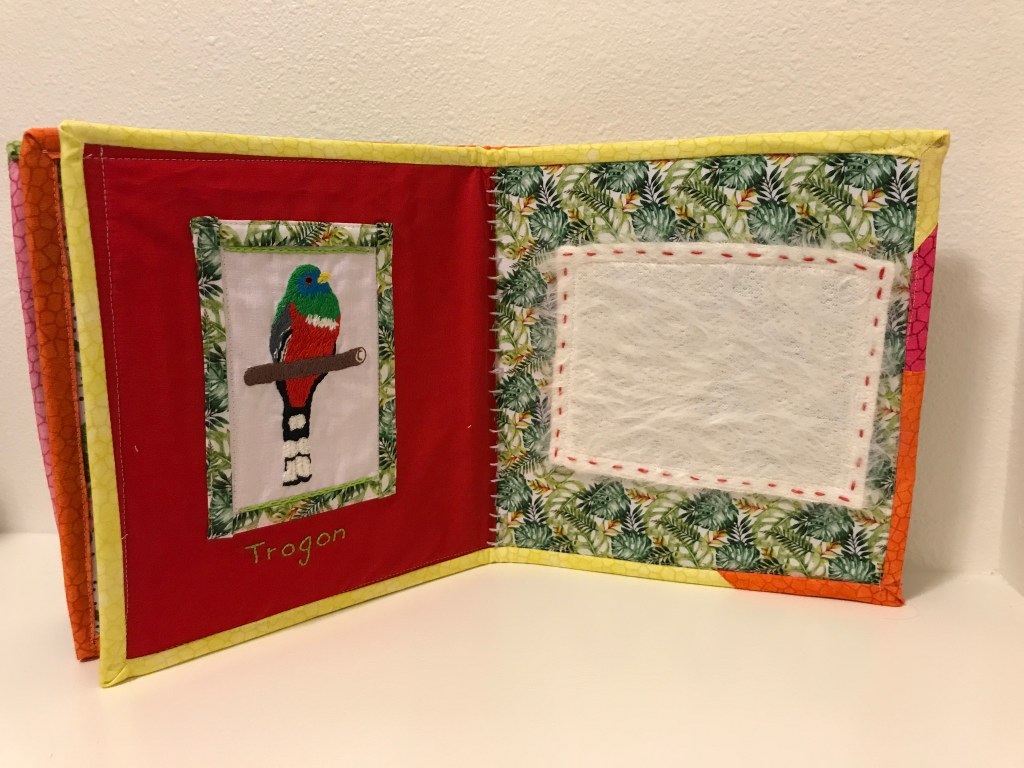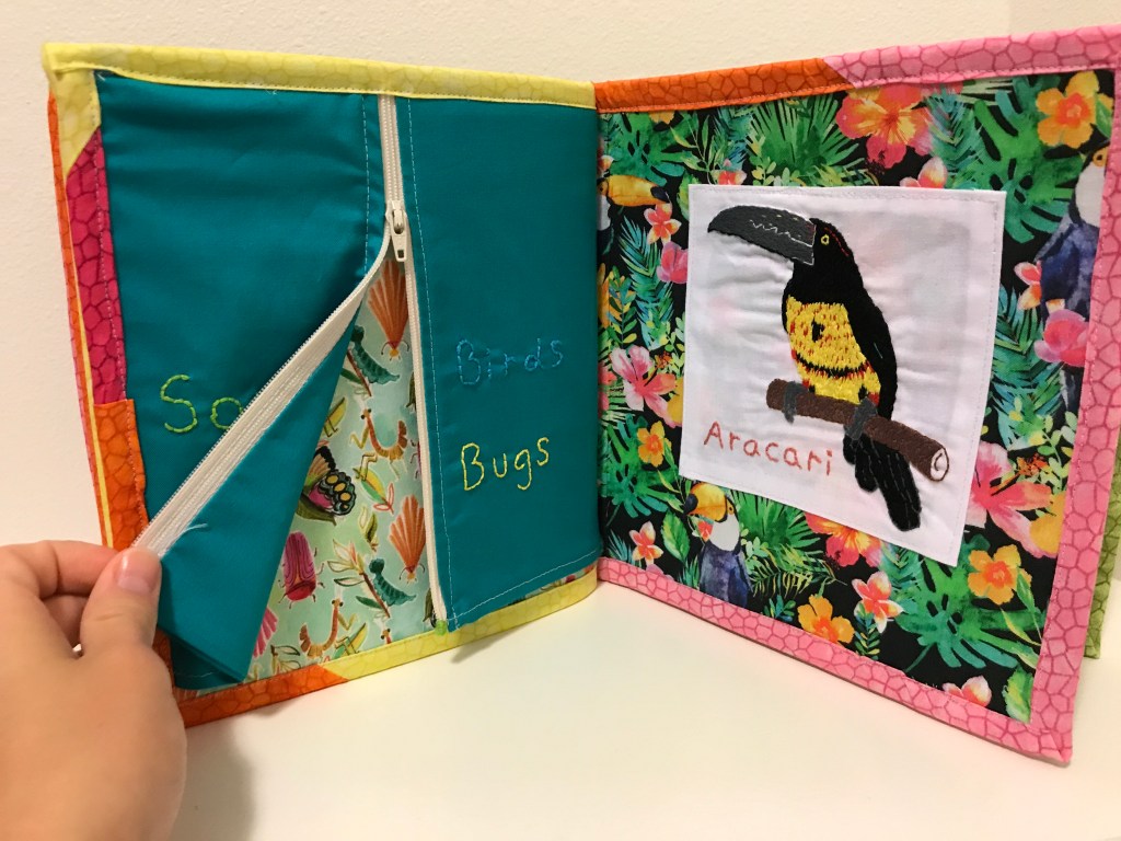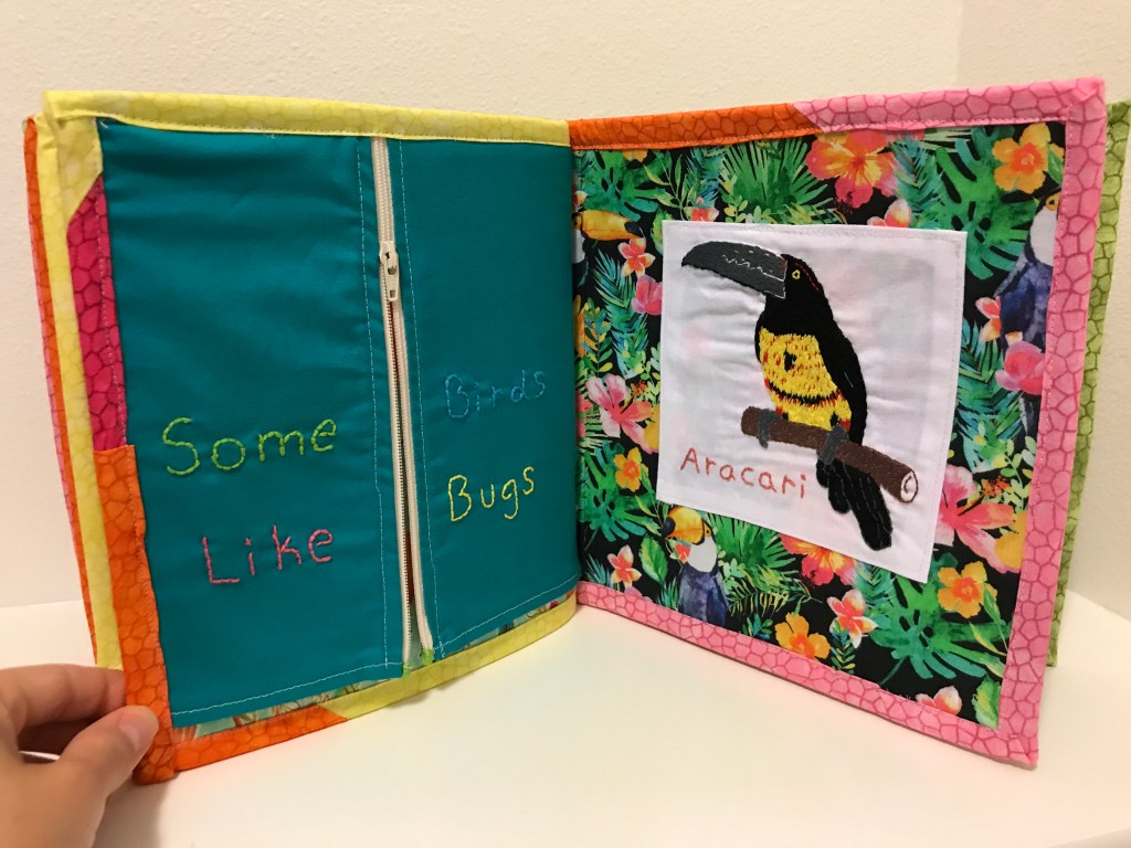 Initially, I thought I would do birds of Panama, A-Z, but when I realized I had a deadline, I knew I wasn’t going to have time to hand embroider all 26 birds. (Also, I realized that 26 pages in a busy book would be incredibly thick) I opted to use the ones I had already finished and then fill in holes as needed. To do so, I ran around the house looking for items that might be appropriate. I cut the mirror off of an old toy, took buttons, elastic, and a zipper from my sewing box, and ran to a store to find a strip of fabric that would be fun to play with but would be as baby proof as possible.