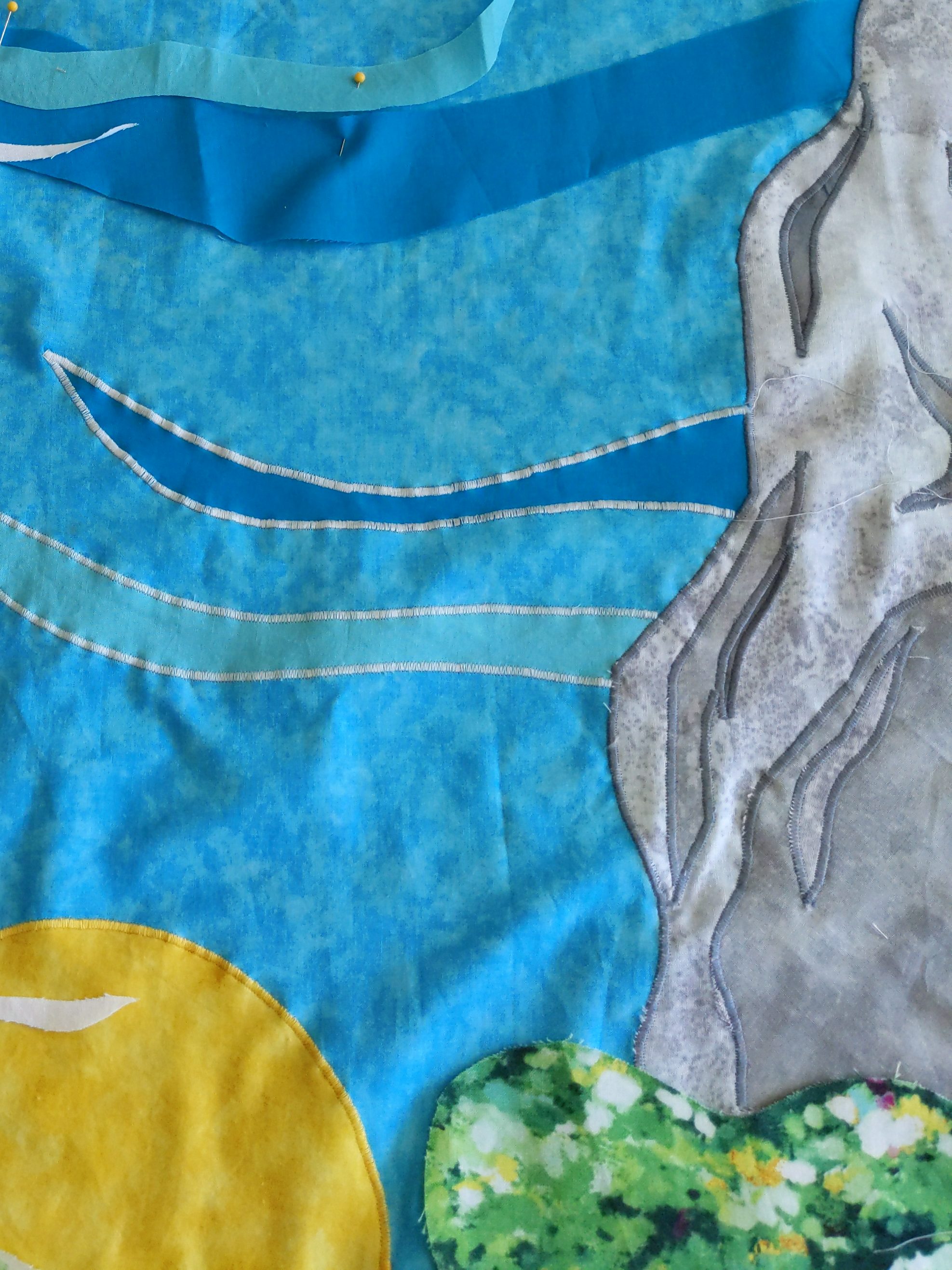 My goal was to have no raw edges, to not use tulle (as they typically do with accidental landscaping), and to not have vertical seams in the rolling hills, ocean, or sky.
