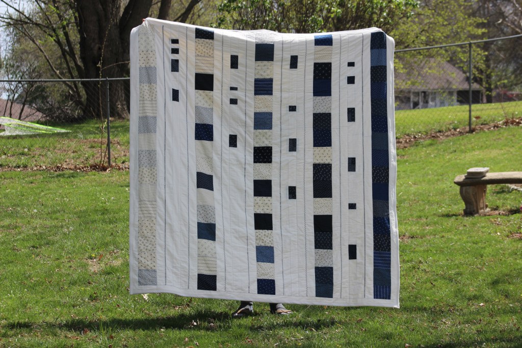 Disclaimer: I did not follow a pattern for this quilt, but I did base it off of a quilt that my friend found online and liked. It is essentially identical to the original one since my friend really liked it. You can find the original quilt here: http://quiltingdigest.com/crisp-blue-and-white-make-a-stunning-quilt/
