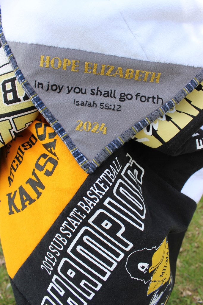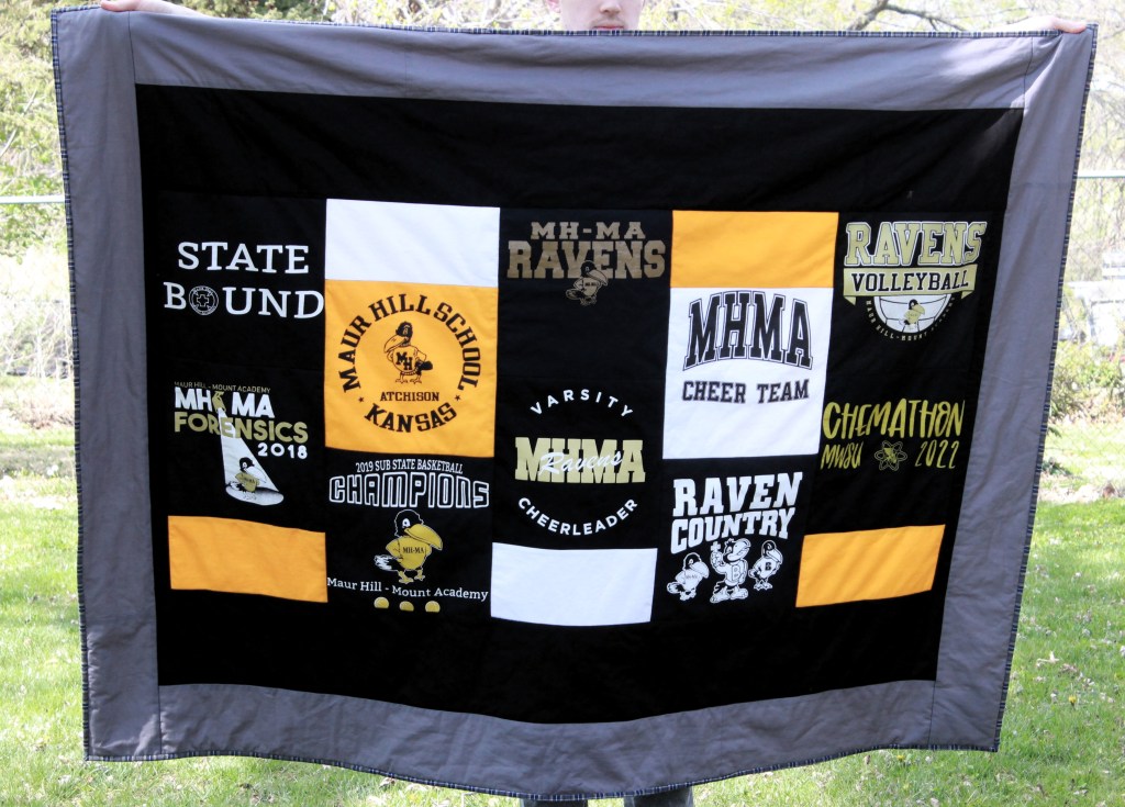 This was a t-shirt quilt I did for a senior. My favorite detail on this quilt is the binding. I was able to get my hands on some old uniform skirts (the same uniform she wore from Kindergarten to Senior year) and it worked exceptionally well as a binding. I was worried that it would be too thick, but it worked out just fine. I think it will hold up well since I’m sure this one will get a lot of use.