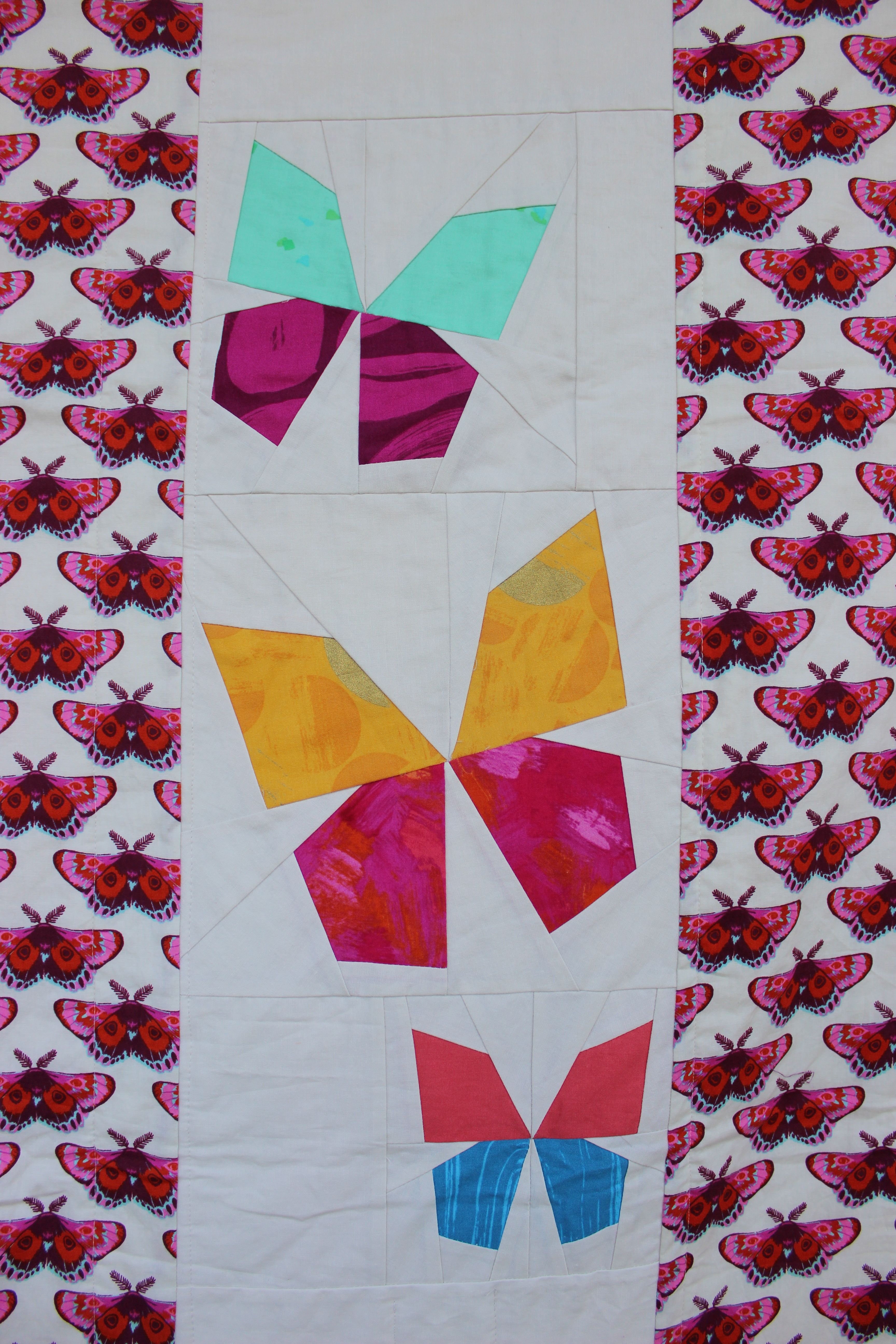 The project ended up in a box and I worked on it periodically but never got far. Five years later, I acquired my own machine and began other projects. Fast forward a few more years and the project finally got moved from it’s original home to my new house where it promptly sat in a closet because I didn’t know what to do with it and I knew I wasn’t going to be able to quilt it well at all.