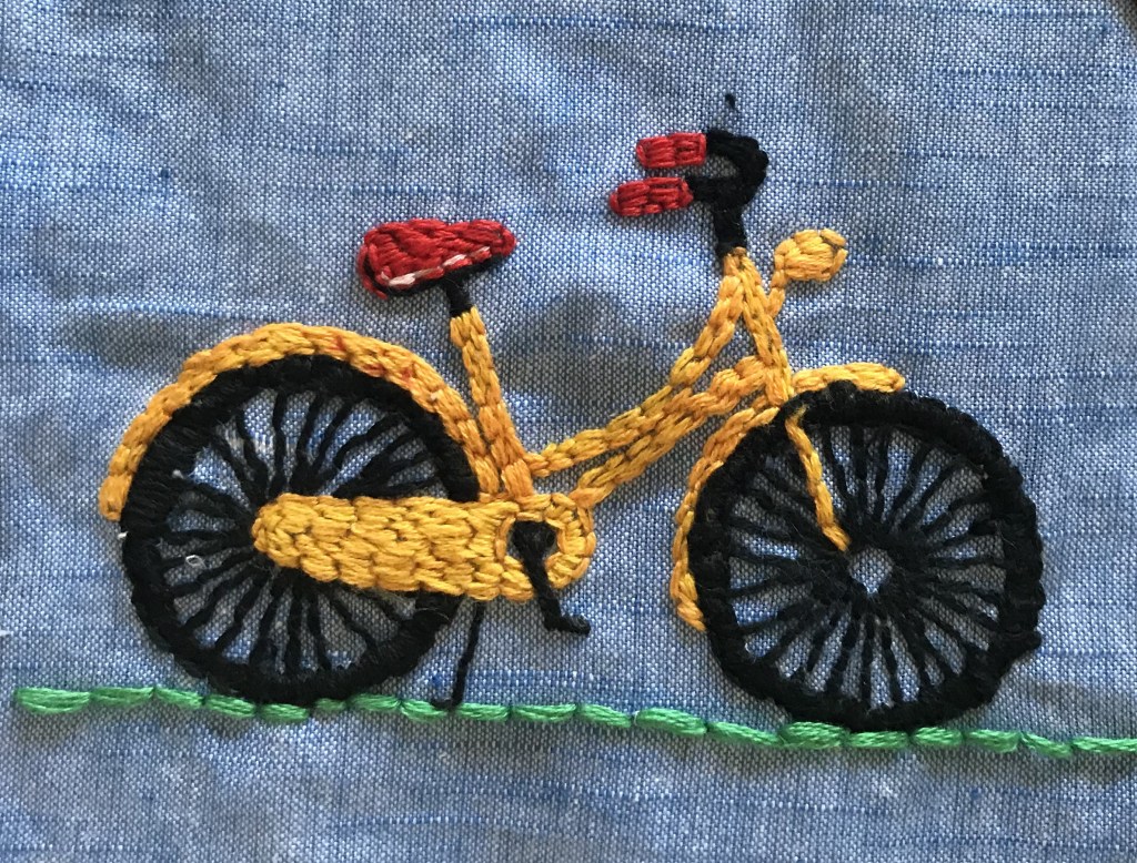 The embroidery was actually really fun and simple. I was concerned about how a beginner like myself was going to embroider something as intricate as a bicycle until I came up with an idea that I will definitely use again. I had some fabric that had larger bicycles on it. I cut a square piece around the bike that I wanted to use, pinned it in place where I wanted it to go and then used it as a template to embroider over. The difficult part about this is getting rid of the excess template fabric when you are done. It almost took me longer to do this than it had taken me to do the embroidery. Using a seam ripper, tweezers, small scissors, and a pin, I managed to pull the fabric apart thread by thread until there was no fabric left. I switched from the seam ripper to a simple pin because I did put a small hole into my work that I had to fix later, so be careful if you are going to do that and good luck to you.